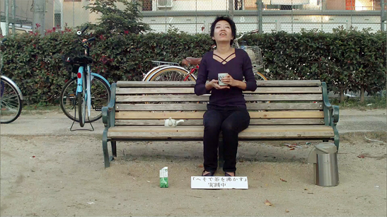| Setting (somewhat stupid) sign, saying "now boiling tea by my navel" |